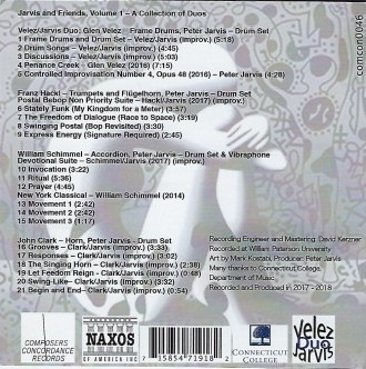 Jarvis and Friends Volume 1, is a collection of mostly improvised duo collaborations for drum set with, horn, accordion frame drums and trumpets. Percussionist (drum set and vibraphone) Peter Jarvis has teamed up with some of the finest musicians in the world including: Glen Velez – frame drums, Franz Hackl – trumpets, William Schimmel – accordion and John Clark – horn to produce this creative volume of music. In addition to the improvisations, included are three fully composed pieces, one each, by Peter Jarvis, William Schimmel and Glen Velez.